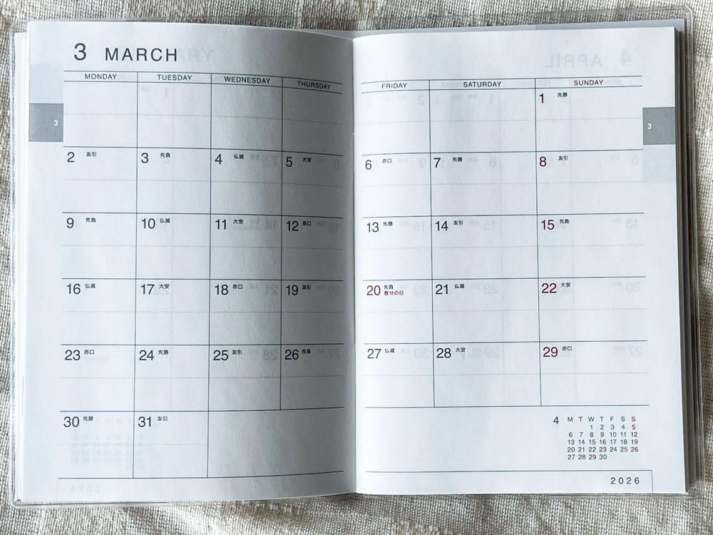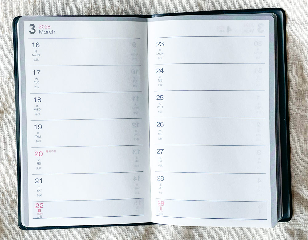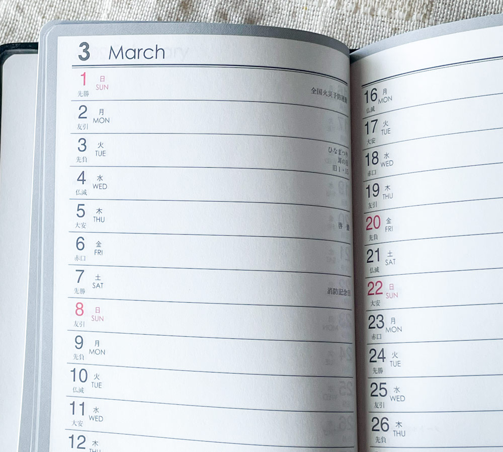 特徴はこの月間ページで、縦に日付が並んでいます。