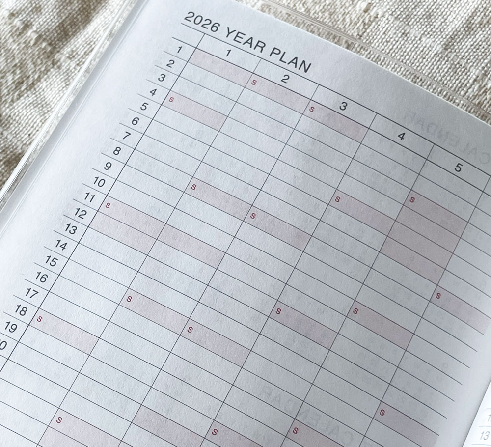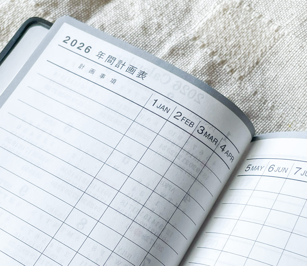 2冊目のこちらも100円で、良くあるパターンの年間と月間、そして半分以上は方眼のノートになっています。